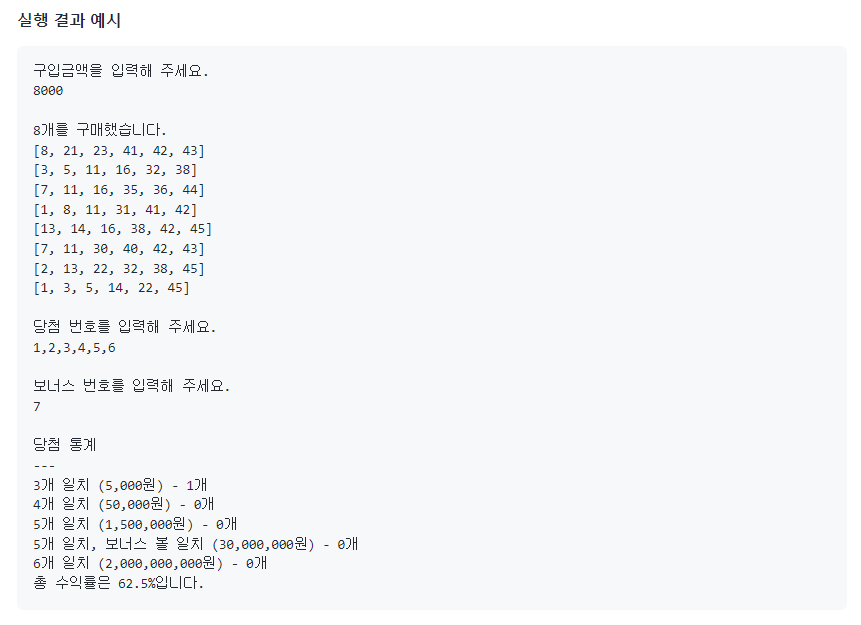 - 당첨 번호 추첨 시 중복되지 않는 숫자 6개와 보너스 번호 1개를 뽑는다.