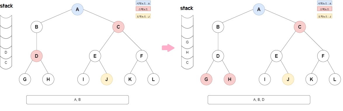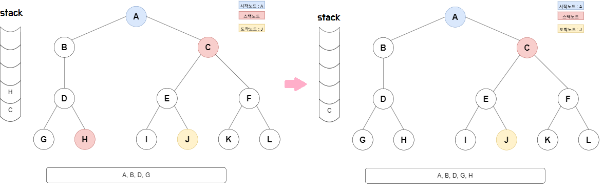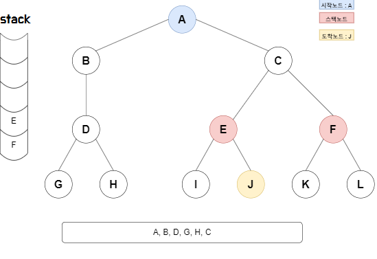 DFS 경로 => A, B, D, G, H, C