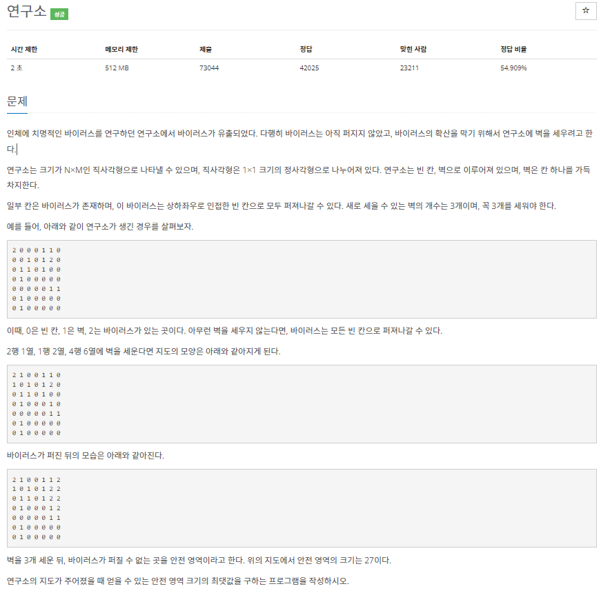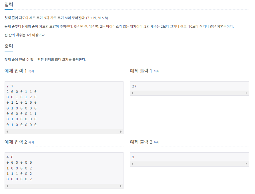 bfs를 통해 바이러스를 전파시키고 안전영역 크기의 최댓값을 구해야 하기 때문에