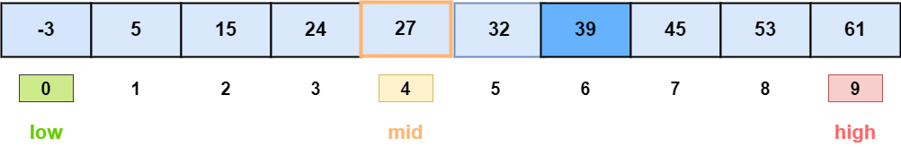 A [4] (27) < key (39) 이므로 배열의 오른쪽 구간을 검색 범위로 정한다.