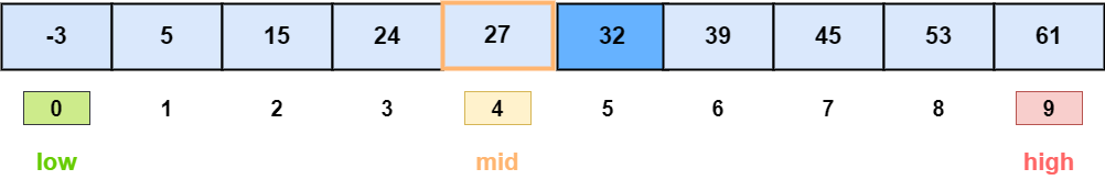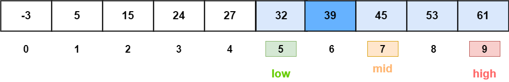 2. 배열의 중간 값을 가져온다. (low = 5, high = 9, mid = 7)