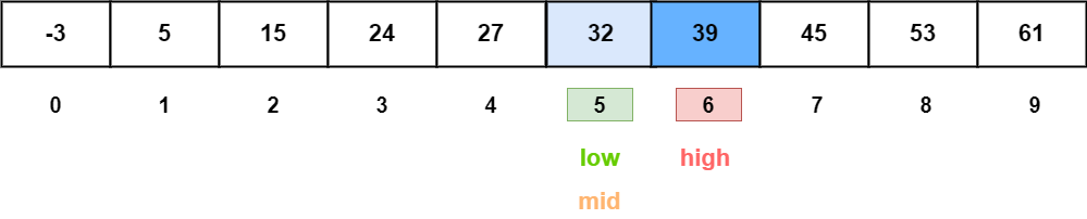 A [5] (32) < key (39) 이므로 배열의 오른쪽 구간을 탐색 범위로 정한다.