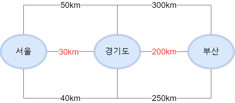 답은 (서울 -> 경기도) 30km , (경기도 -> 부산) 200km 30+200으로 서울에서 경기도를 거쳐 부산의 최단경로는 230km이다.