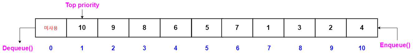 - dequeue() - queue에서 최대 우선순위 요소를 삭제하고 그 값을 반환한다.