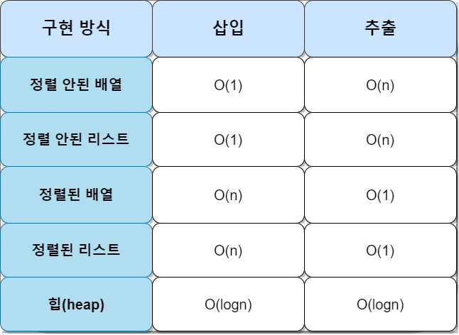 우선순위 큐를 구현하는 데 있어 데이터 삽입, 추출 시간복잡도