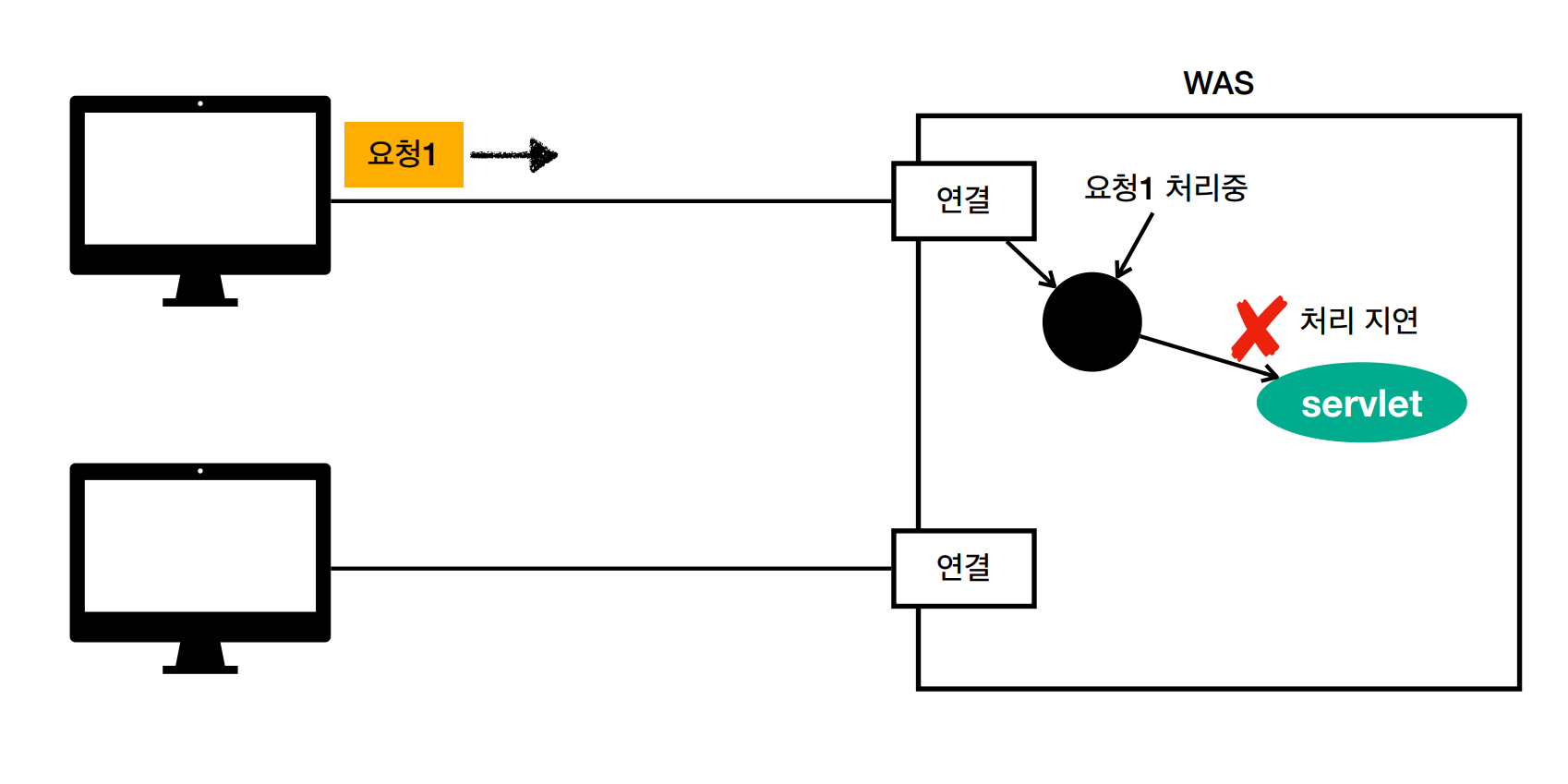 - 동시요청이 많으면, 서버리소스는 여유롭지만, 클라이언트는 금방응답지연한다.