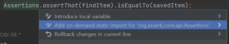참고로 여기서 assertThat은 다음 import 사용에 대해 static을 선언함으로써 더 편리하게 사용해 주는 Assertions 선언이다.