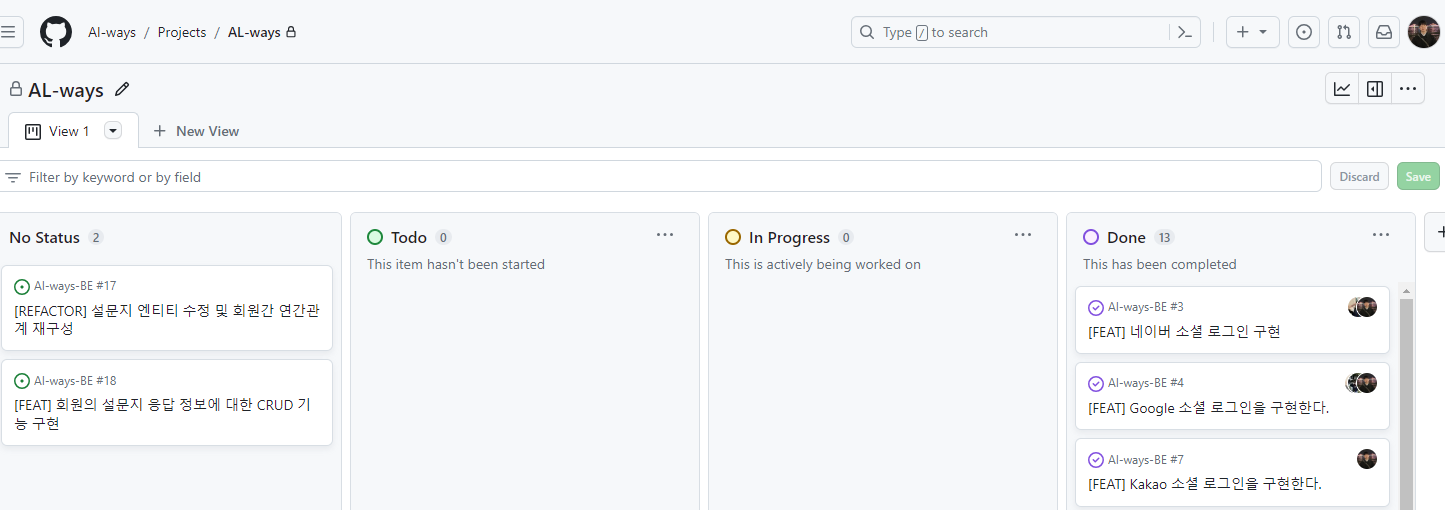 이를 깃허브 프로젝트 탭을 활용하여 프로젝트 진행사항을 한눈에 볼 수 있으며