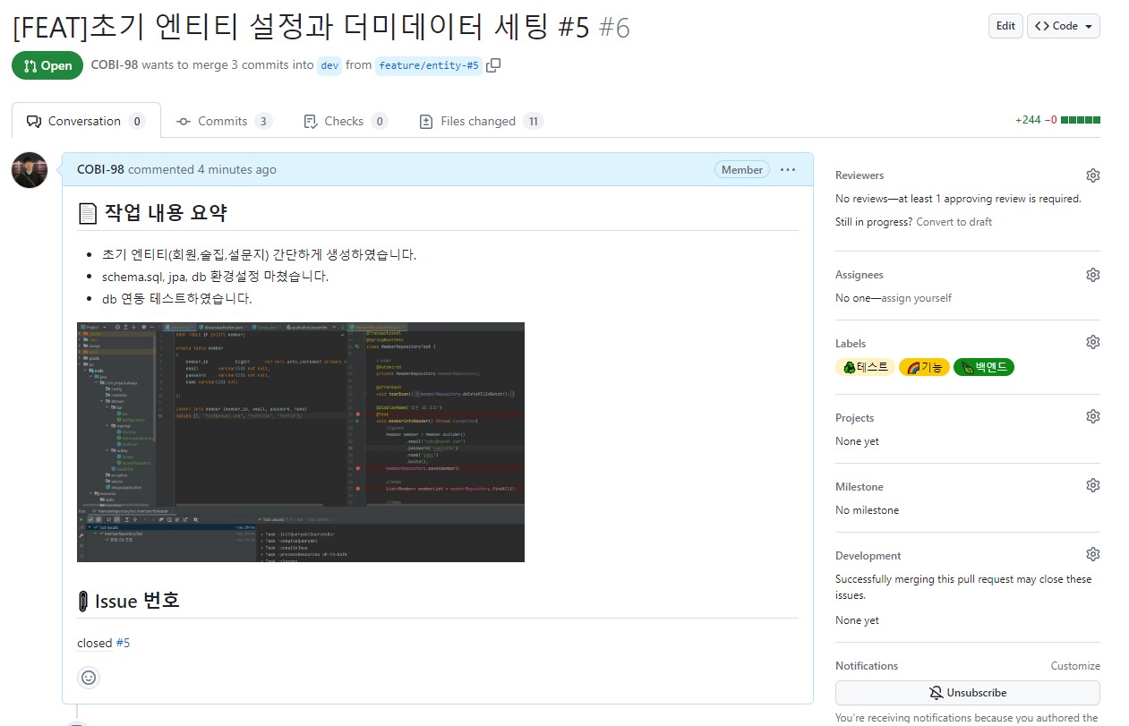 2. PR 제목과 내용 Issue 번호 작성 후 ([FEAT] 초기 엔티티 설정과 더미네이터 세팅 #해당이슈넘버)