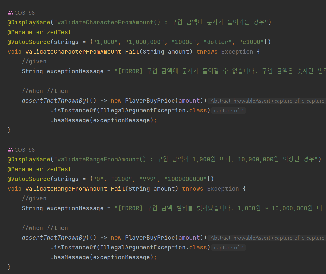 무엇을 테스트하는지 명확하게 알 수 없는 test 메서드 네이밍의 문제가 가장 컸다고 생각합니다.