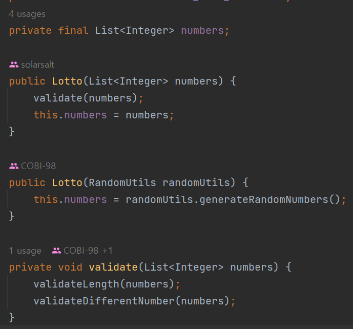 그래서 저는 Lotto 클래스가 두 가지 역할을 수행할 수 있도록 구현하는 것을 결정했습니다.