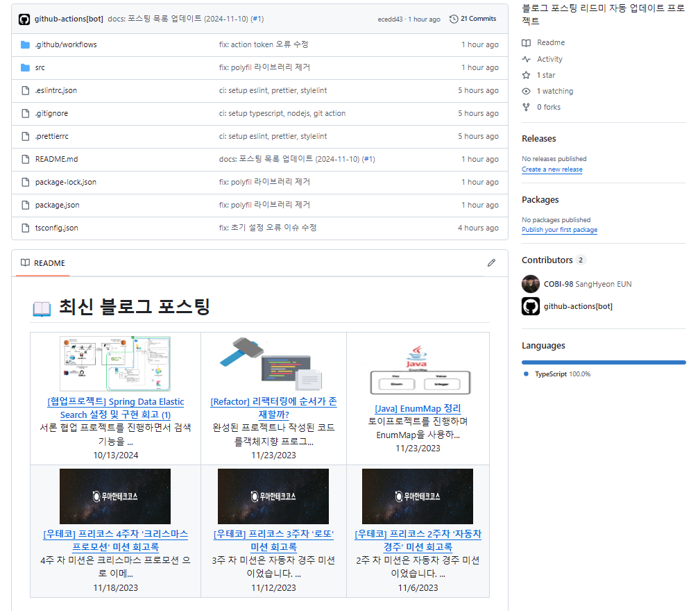 - TypeScript services: 수집한 정보를 바탕으로 README 파일에 업데이트할 테이블 형태로 데이터 구조화